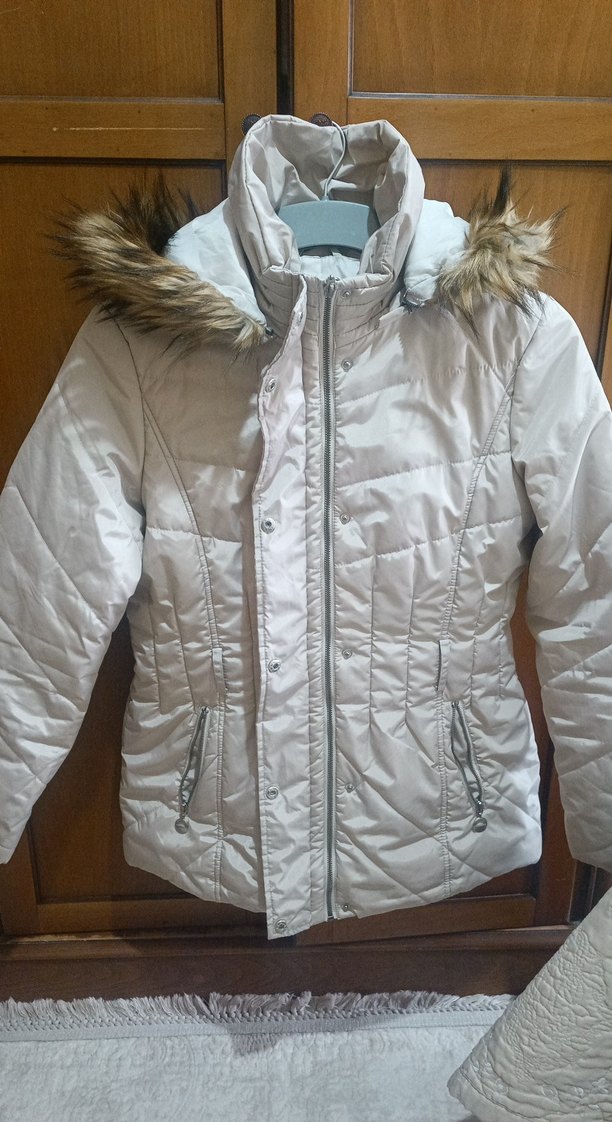 Kürk detaylı kapüşonlu beyaz kadın kışlık mont. Sentetik kumaştan, kesimi vücuda oturan ve midi boyda, dış mekan kullanımı için uygun. ❄️arka kısmında çok küçük bir deformasyon vardır son resimde görüldüğü gibidir.onun dışında çok az kullanılmıştır.