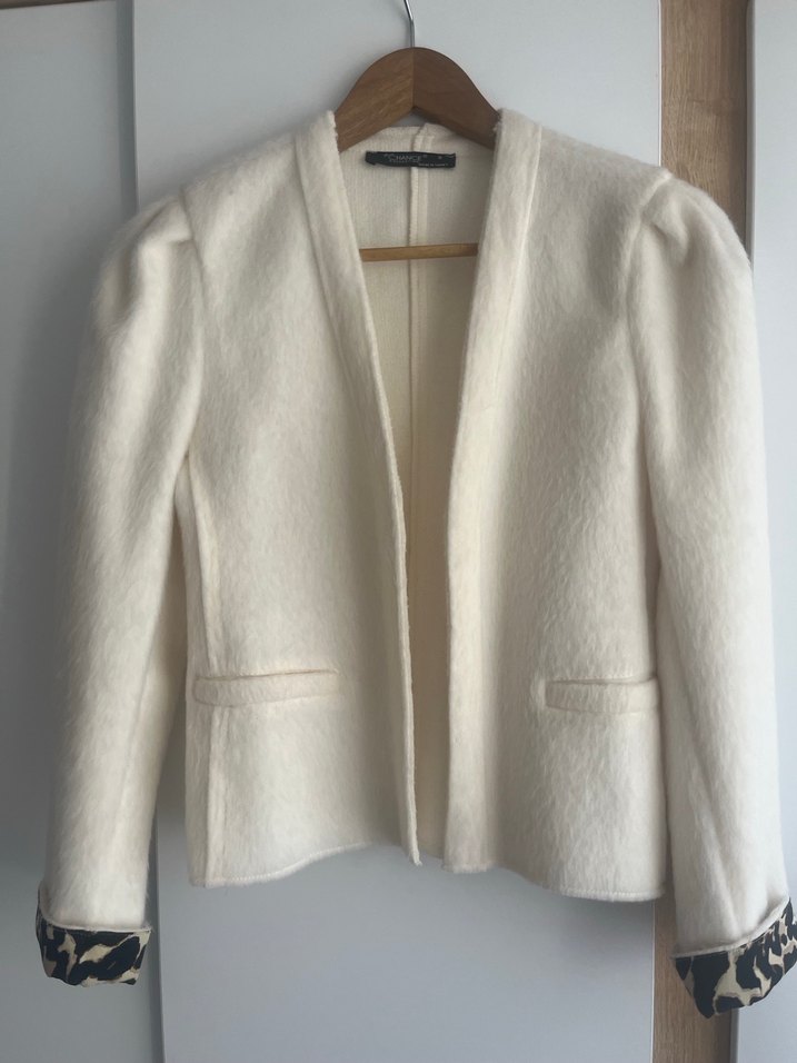 Kürk detaylı, yumuşak ve sıcak kumaştan yapılmış beyaz kadın blazer. Normal kesim ve leopar desenli manşetlerle modern klasik stil sunar.