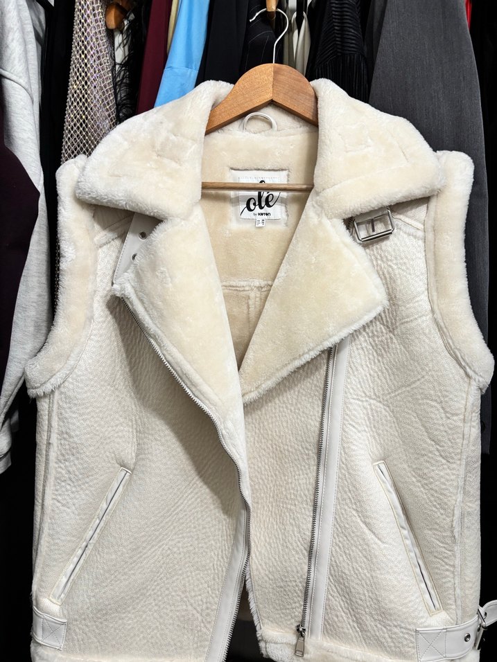 Kürk detaylı yaka ve beyaz dokusuyla, fitted kesimde, kolsuz kadın yelek. Rahat ve şık sokak stili için ideal. Normal uzunlukta, fermuarlı. Minik 2 adet kusuru vardır son 2 fotoda mevcut Sadece 1 kez giydim.