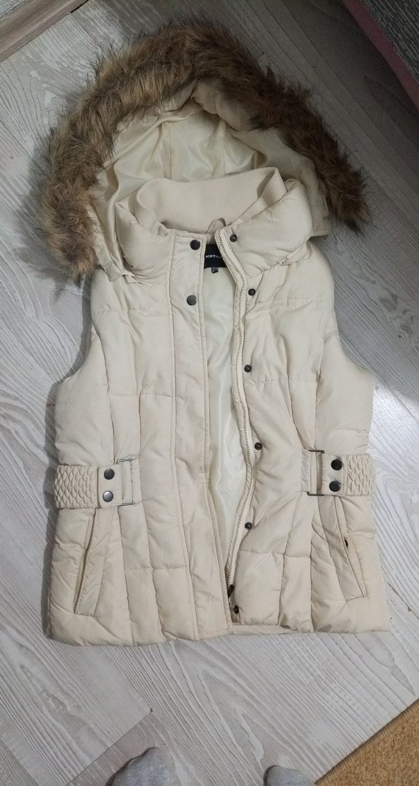Kürk detaylı, kolu olmayan beyaz yelek. Yumuşak sentetik kumaştan, kesimi vücuda oturan, rahat ve şık görünüm sunar.