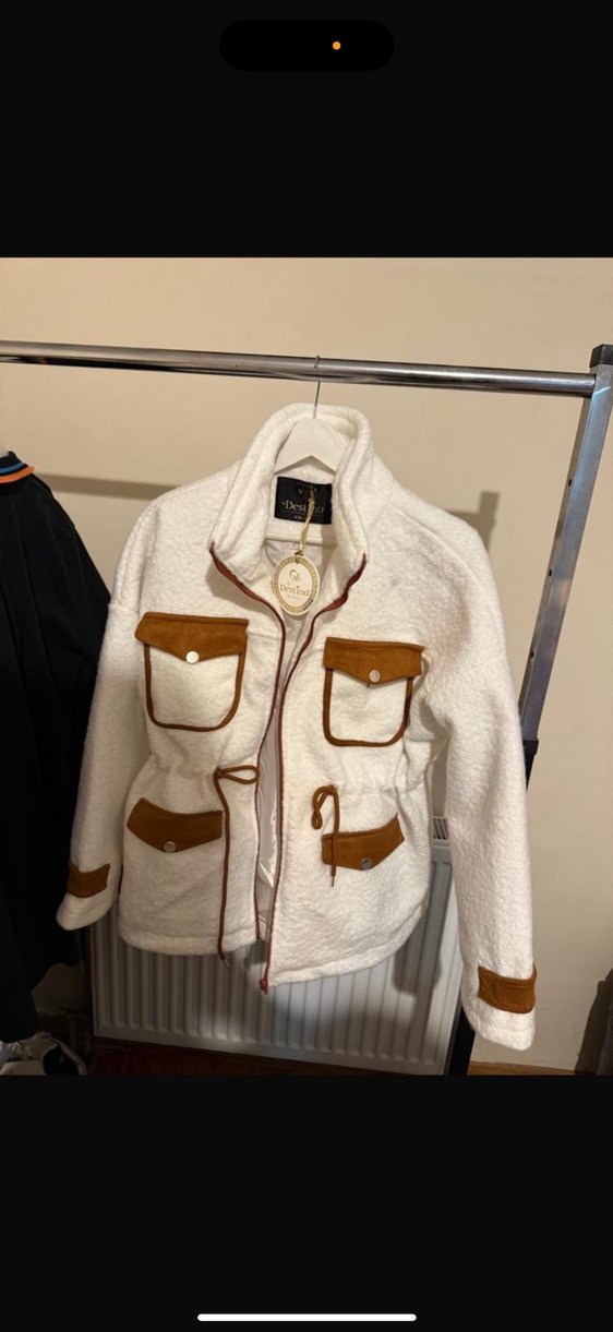 Kürk detaylı beyaz midi ceket, yüksek yakalı ve uzun kollu, yumuşak ve sıcak kumaştan yapılmıştır. Bol kesim, kahverengi detaylı dört cep ve ön fermuarlı.