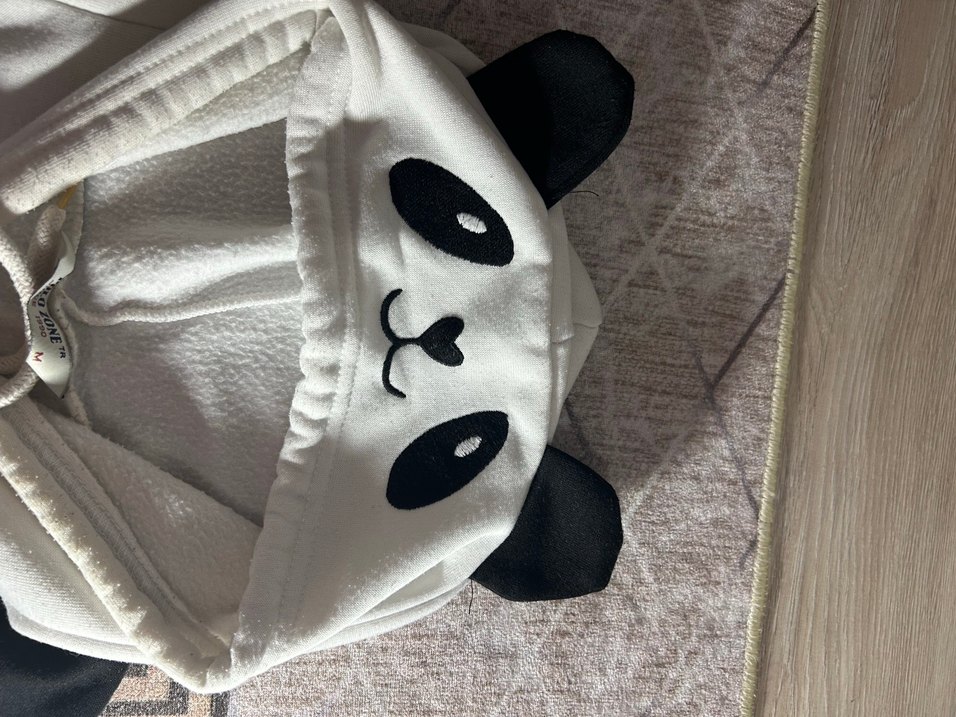 Kürk detaylı, baskılı panda yüzlü beyaz kedi kıyafeti, siyah kulaklı ve streetwear tarzında.