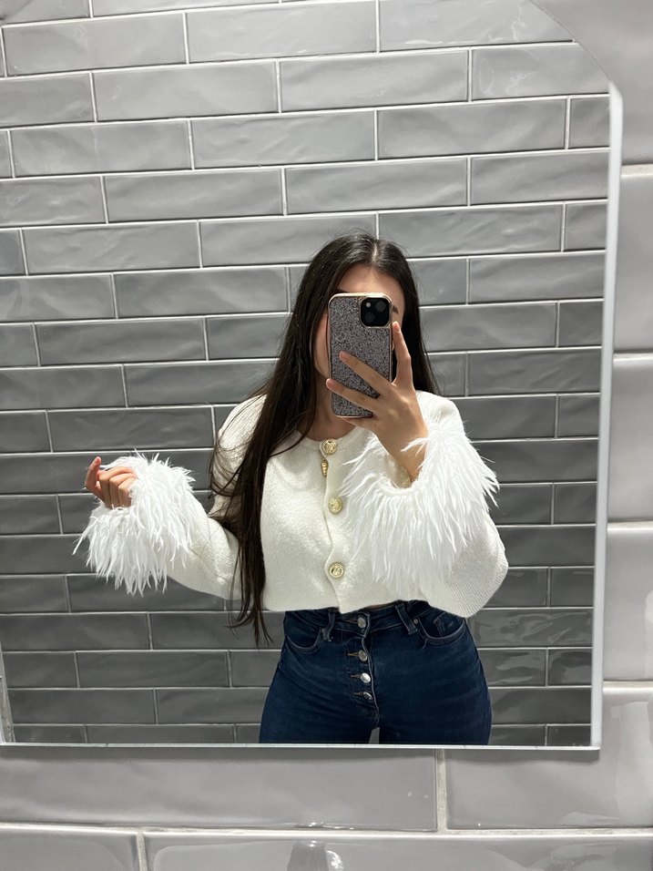 Beyaz, uzun kollu, kürk detaylı, straplez yaka ve normal midi boyda, yumuşak denim kumaştan kadın bluz. Trendy ve rahat sokak stili için uygundur. ❄️