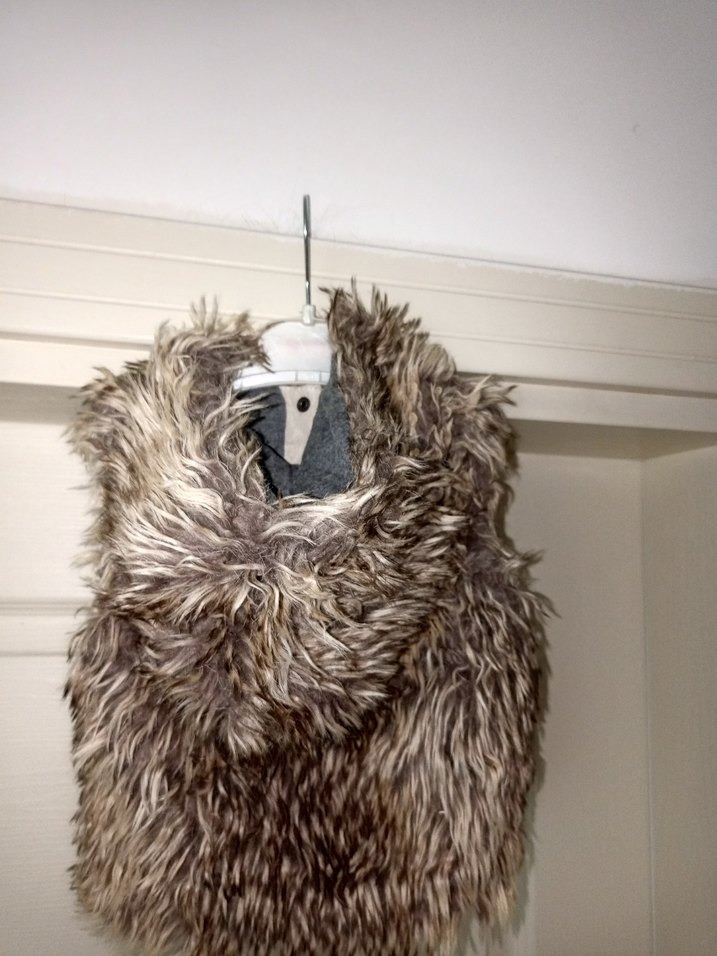Kürk detaylı, yaka tipi yakalı, yün kumaştan yapılmış bohem tarzda, leopar desenli, normal boyda ve fitted kesim cocuk yelek.