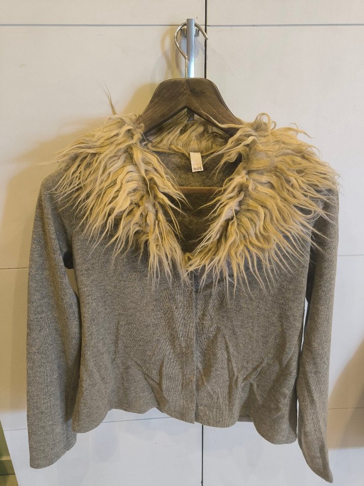 Kürk detaylı, tek renk bohem stilinde, uzun kollu, normal boy, bej-gri tonlarında rahat kesim yünlü bir kadın hırkasıdır.İki koltukaltı arası 50 cm.Omuzdan etekucuna 51cm.