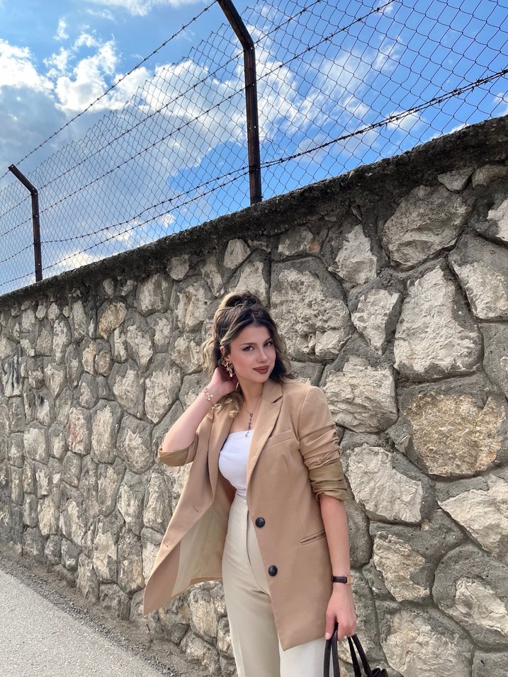 Kürk detaylı, uzun kesim camel renkli kadın deri blazer. Notch yaka ve uzun kollu, rahat kesimli, desen içermeyen sokak stili için uygun.