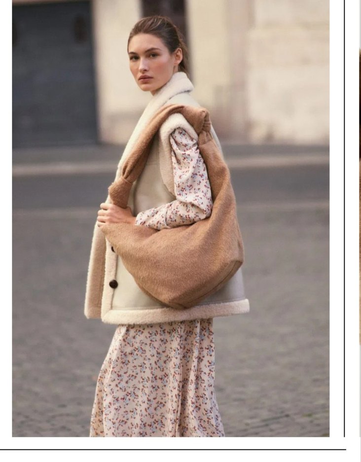 Yumuşak ve sıcak kumaştan, kürk detaylı ve etnik desenli camel renk kadın omuz çantası. Günlük kullanıma uygun, rahat ve normcore tarzda.