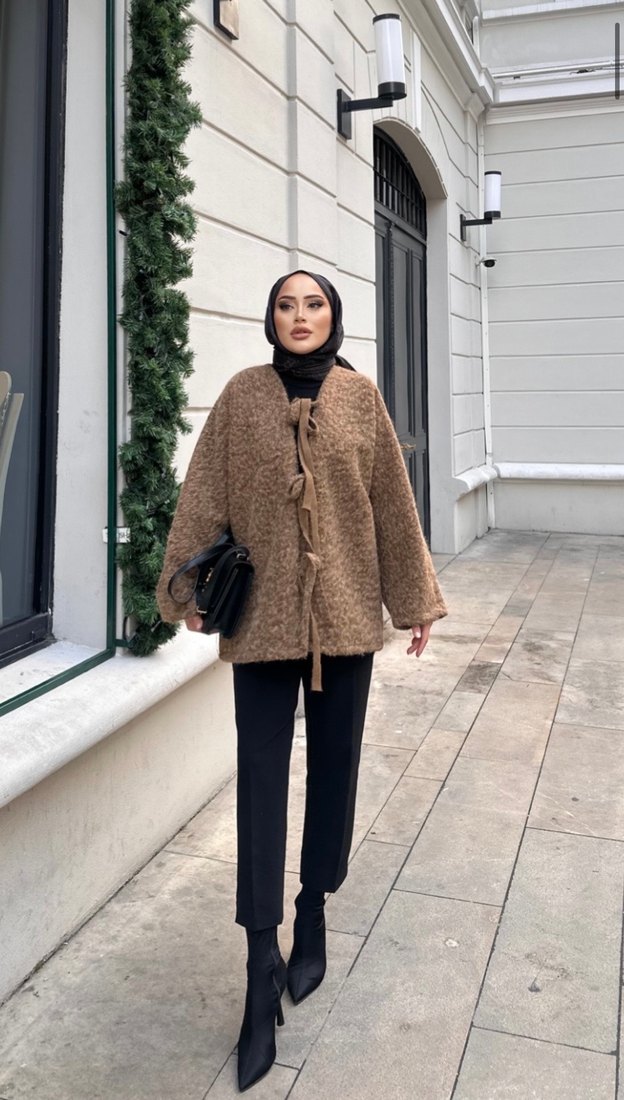 Kürk detaylı, etnik desenli camel renkli yün kaban, bol kesim, çıtçıtlı, normal boy, uzun kollu ve şık yaka detayına sahip.