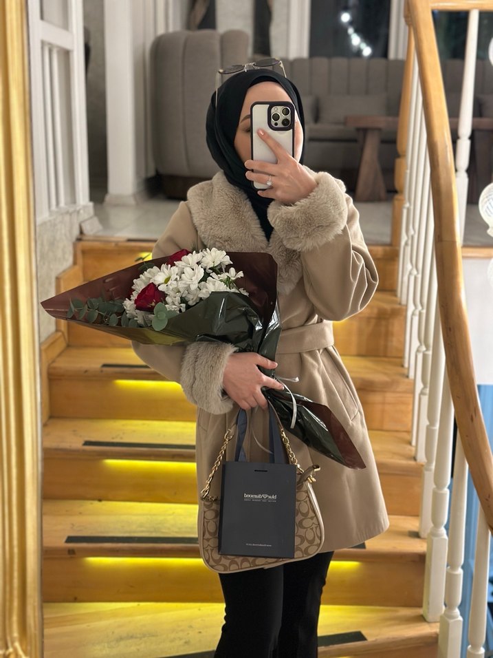 Yakadaki kürk kısmı çıkarılıp takılabilir Camel renginde süet kumaştan yapılmış, kürk detaylı yakası ve manşetleri olan, normal kesim midi uzunluğunda kadın trençkot. Günlük kullanım için uygundur.