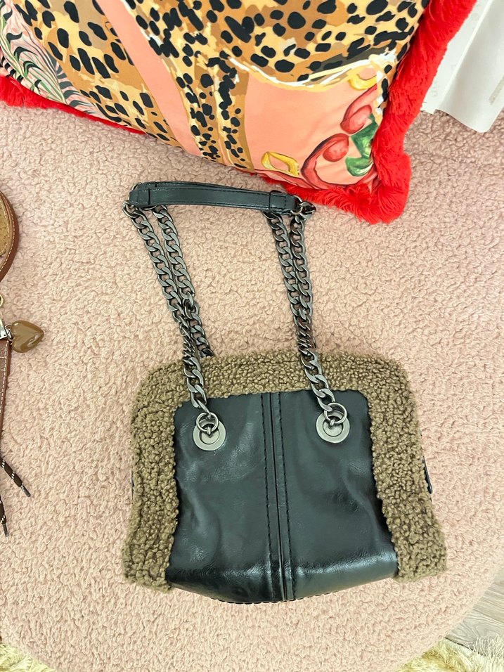 Koyu kahverengi deri çanta, kıyılarını saran kürk detayları ve zincir askısıyla rahat ve avangart bir tarz sunar. Günlük kullanıma uygundur. Çok severek kullandım ama artık başka çantalara yer açmak istiyorum