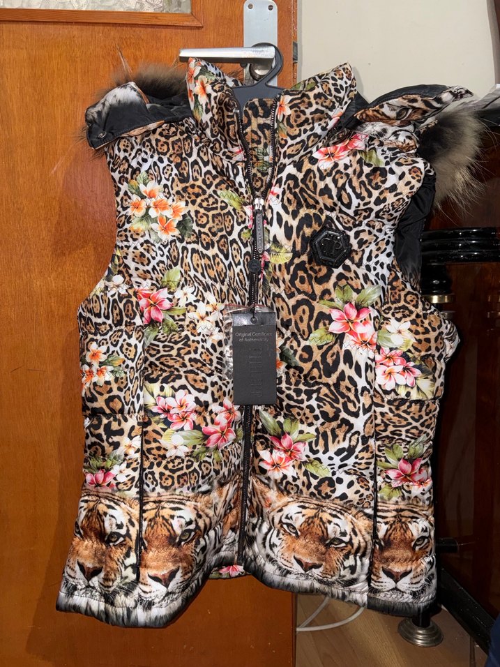 Kürk detaylı, straplez yaka gerçek kürklü marka yelek. Sentetik kumaştan, koyu kahverengi ve desenli, çiçek ve kaplan baskılı, şık sokak tarzı için uygun.