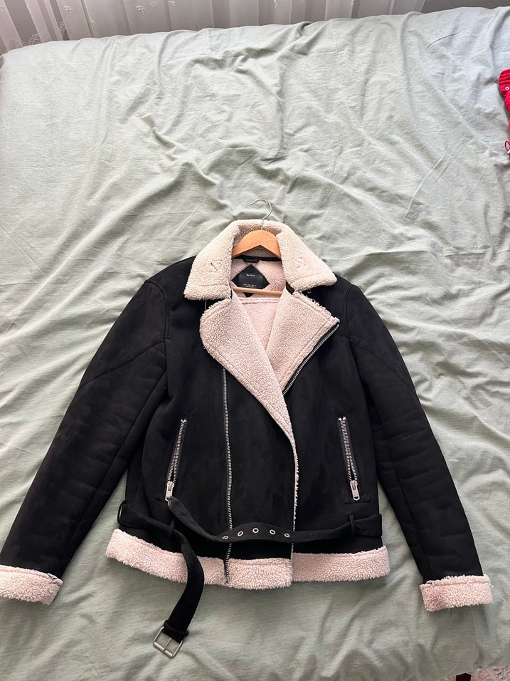 Siyah, kürk detaylı yakası ve bilek uçları olan, kemerli ve fermuarlı cepli, normal boy midi kesim, rahat ve şık erkek ceketi. Herhangi bir defosu yok. Kürk kısmı fotoğrafta da görüldüğü üzere kırık beyaz.