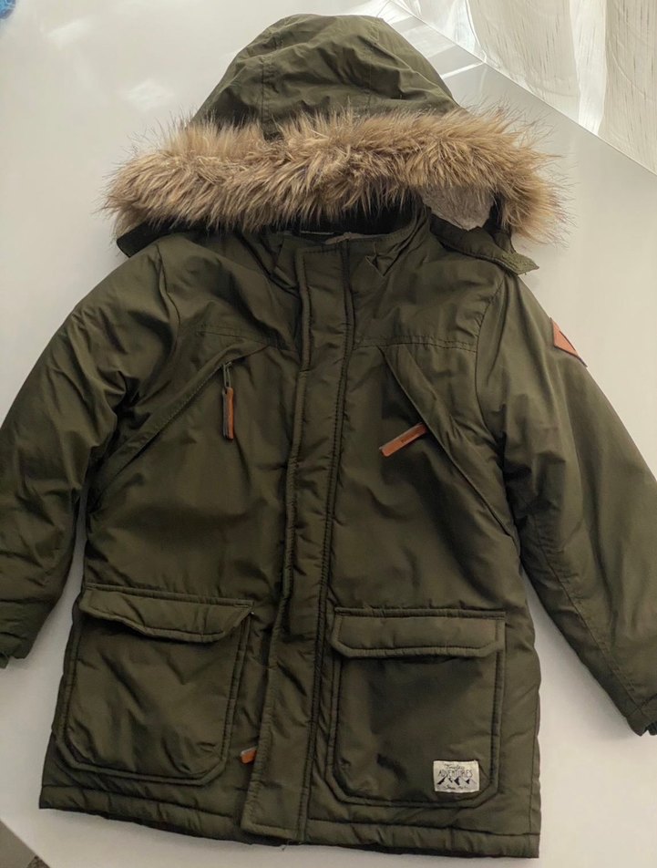 Kürk detaylı kapüşonlu, haki renk dik kesimli erkek çocuk mont. Yumuşak ve sıcak . Su geçirmez