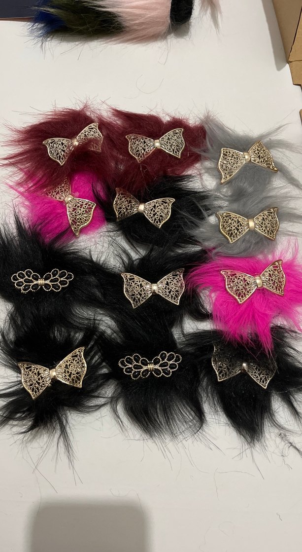 Koyu renkli, çok renkli sentetik kürk ve ince detaylı altın renk fiyonklarla süslenmiş, gotik ve avant-garde tarzda saç tokaları.