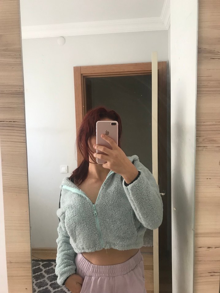 Uzun kollu, yüksek yakalı ve kürk detaylı gri, fitted kadın ceket. Yumuşak ve sıcak dokuda, crop kesim modeldir.