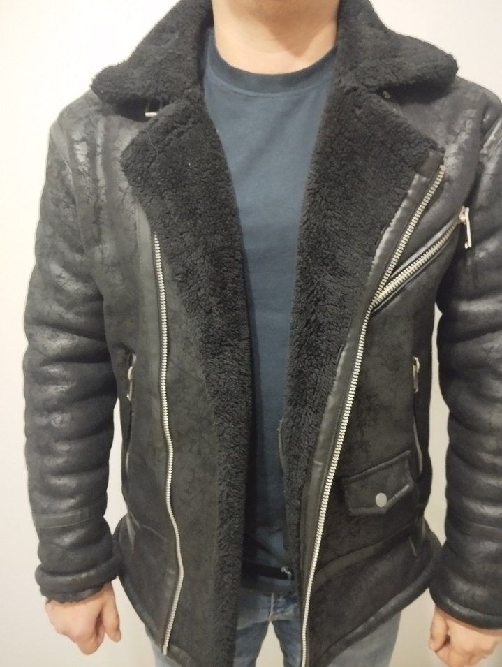 Kürk detaylı, gri deri biker ceket, uzun kollu ve kesik yakalı, trend sokak stili için uygun.