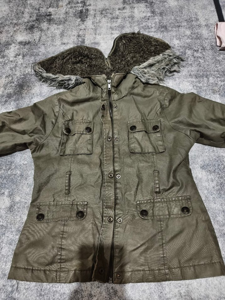 7_8 yaş Kürk detaylı kapüşonlu, gri kamuflaj desenli, sentetik kumaştan yapılmış, uzun kollu ve normal boyda, dar kesim sokak stili ceket.