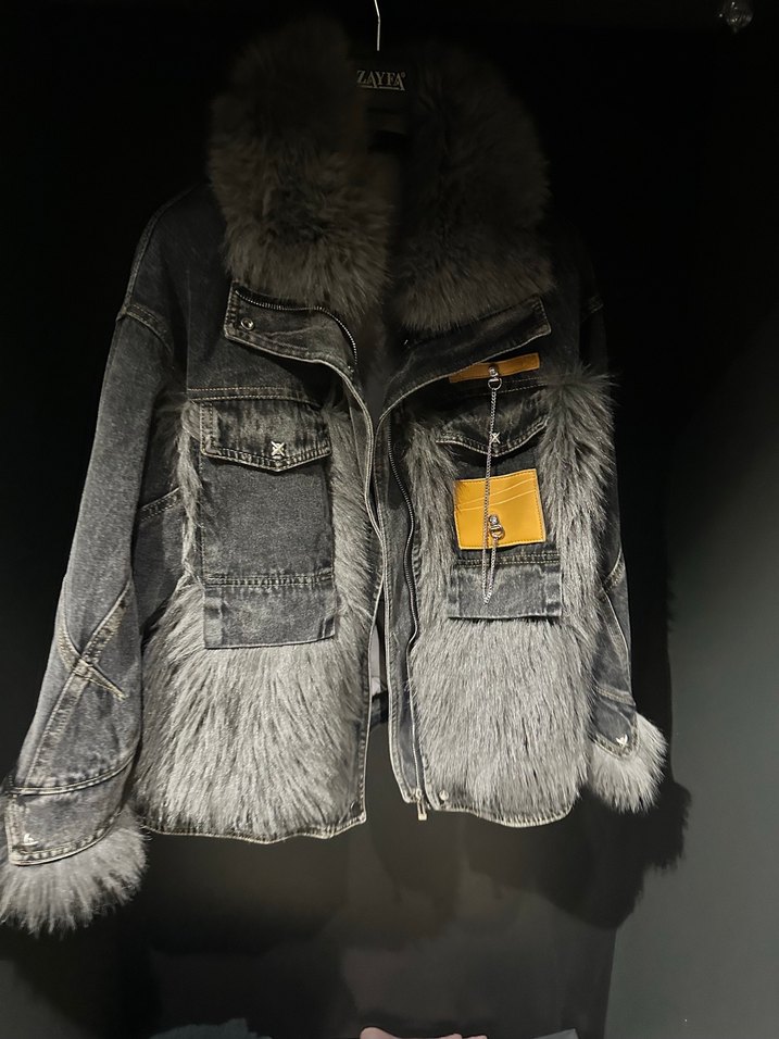 Gri renkte, kürk detaylı, uzun kollu, notched lapel yakalı, desenli, bol kesim kısa denim ceket.İthal Sokak stiline uygun, günlük kullanıma elverişli.