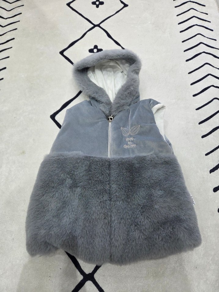 Kürk detaylı, kapüşonlu ve kolsuz gri kız çocuk yeleği. Düz ve dar kesim, sokak modasına uygun şık tasarım.