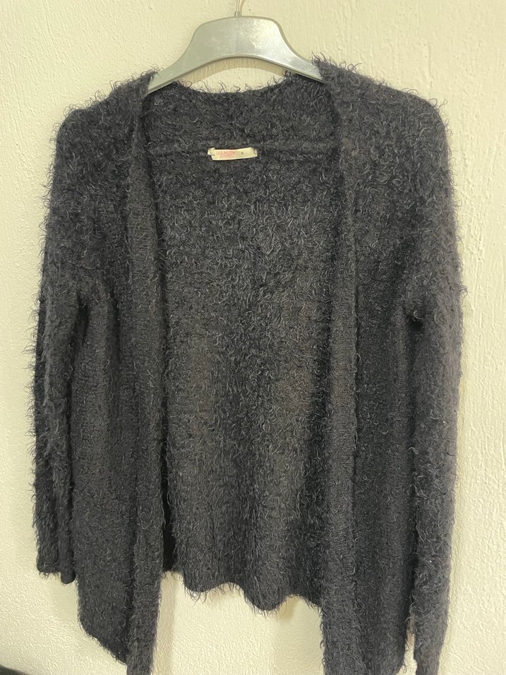 Gri -siyah renkli, uzun kollu ve yuvarlak yaka kadın hırka. Yumuşak yün kumaştan, kürk dokulu ve bol kesimdir. Rahat kullanım için uygundur.