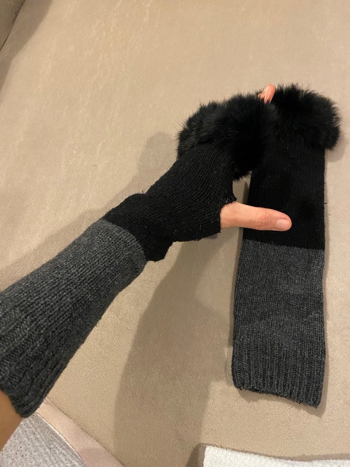 Gri ve siyah yün karışımı, bilekte kürk detaylı kadın eldivenleri, rahat ve trendy gotik tarz sunar.