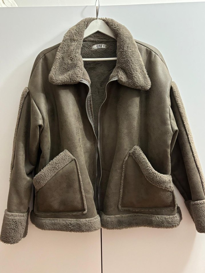 Kadın ceket, bol kesim ve mini boyda, uzun kollu. Yumuşak süet kumaştan ve kürk detaylı yakası, manşetleri, cepleri ve etek ucu ile sıcak tutar. Notlu yaka ve desensiz tasarıma sahip, günlük sokak stiline uygun.