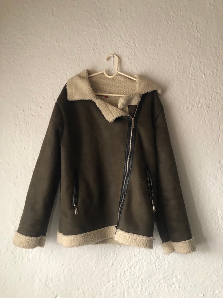 Gri renkte, kürk detaylı süet kadın ceket. Bol kesim, uzun kollu ve normal uzunlukta, notched lapel yaka ve asimetrik fermuar kapamalı.