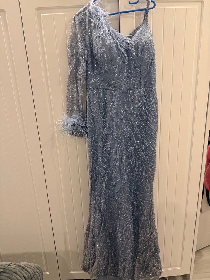 Kürk detaylı uzun kollu, straplez yaka ve vücuda oturan gri abiye elbise, şık ve modern bir görünüm sunar. ✨0 urun
