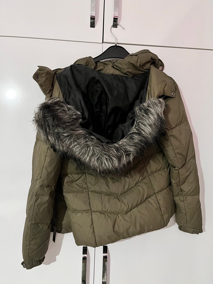 Haki, kürk detaylı kapüşonlu, strappy kollu, yumuşak sentetik kumaştan yapılmış, dış mekan için uygun, fitted kesim kadın kış montu. ❄️