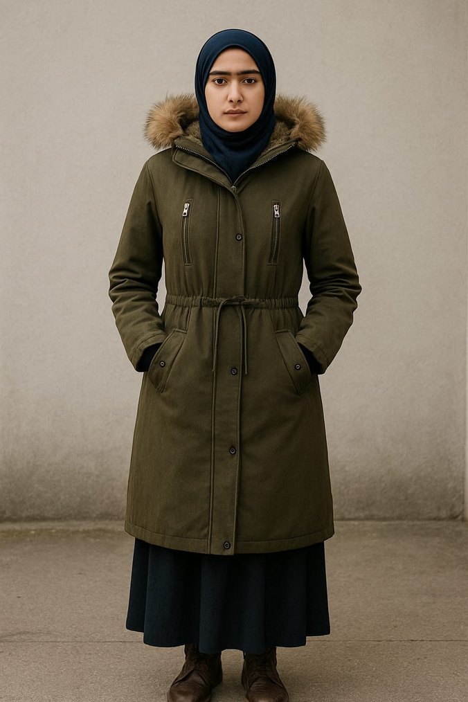 Kürk detaylı kapüşonlu, haki renk yağmur suyu geçmez sokak tarzı mont. Uzun kollu, orta boy, rahat kesim ve yumuşak dokulu kumaştan üretilmiştir. Belden bağcıklı ve ceplidir.