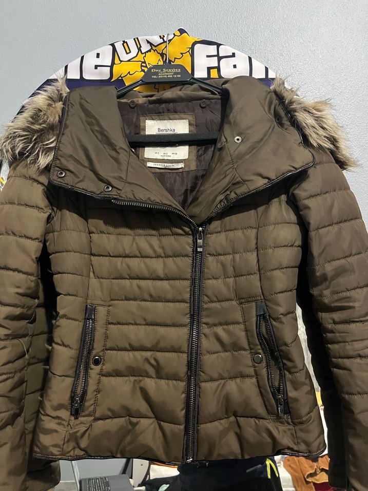 Haki kürk detaylı kapüşonlu,kesimi oturan kadın kışlık mont. Sentetik kumaştan, normal midi boyda, desen içermeyen, dış mekan için uygun. Dar geldiği için giymiyorum artık temiz kullanıldı