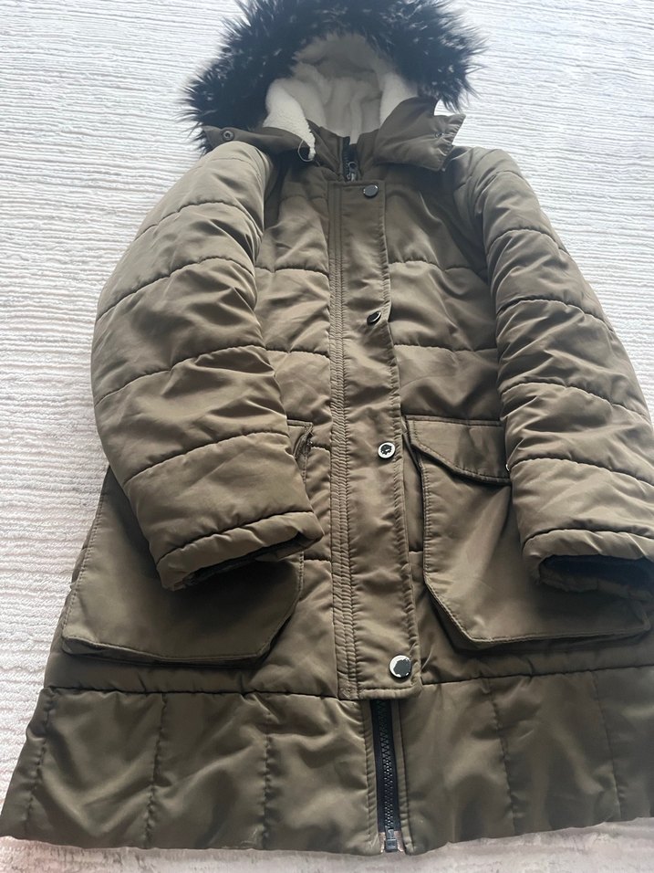 Kürk detaylı kapüşonlu, haki çocuk montu. Notlu yaka, normal midi uzunluk içi kürklü sıcacık .