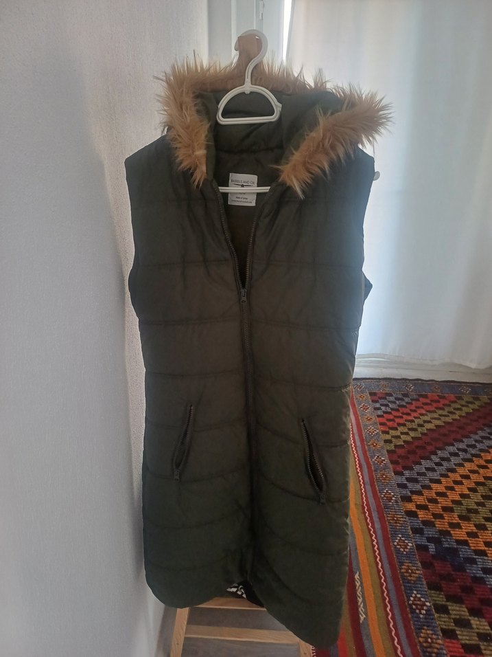 Yüksek yakalı, kürk detaylı kapüşonlu haki yeşili yelek. Diz boyu, kolsuz ve vücuda oturan kesimle rahat ve sıcak tutar.