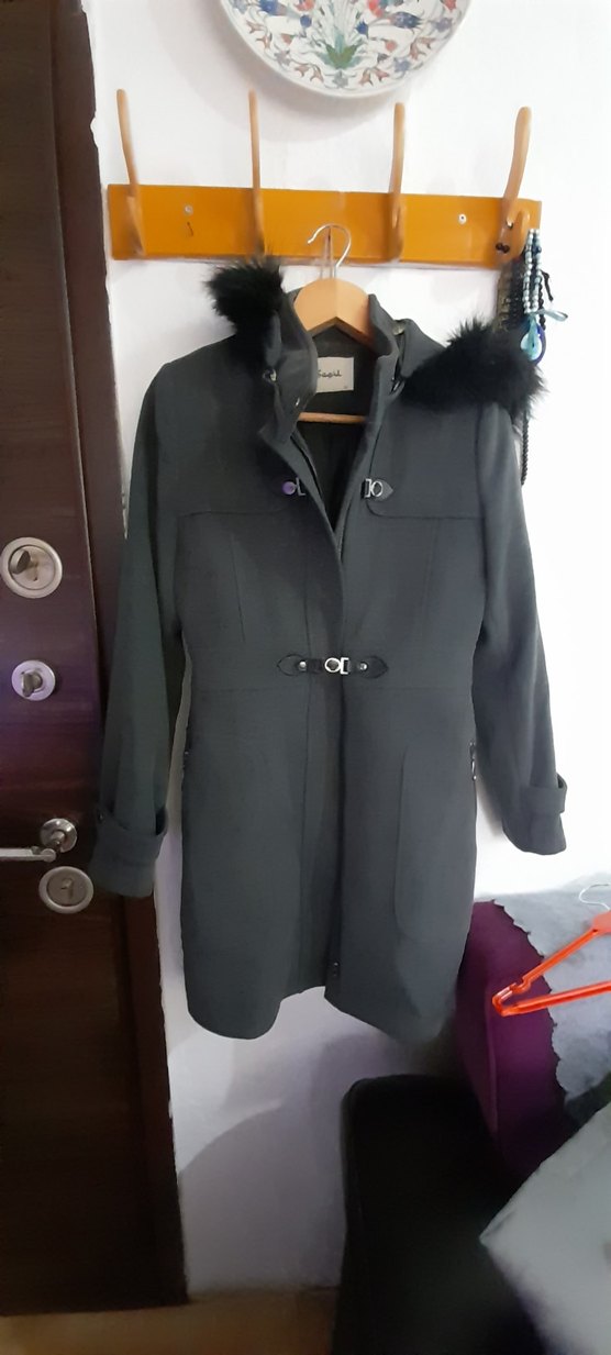Kürk detaylı, yakası kesik ve strappy kollu antrasit kaban. Normal midi boyda, yumuşak ve sıcak kumaştan ofis için uygun goth tarzı.sifir ayarin da tertemiz