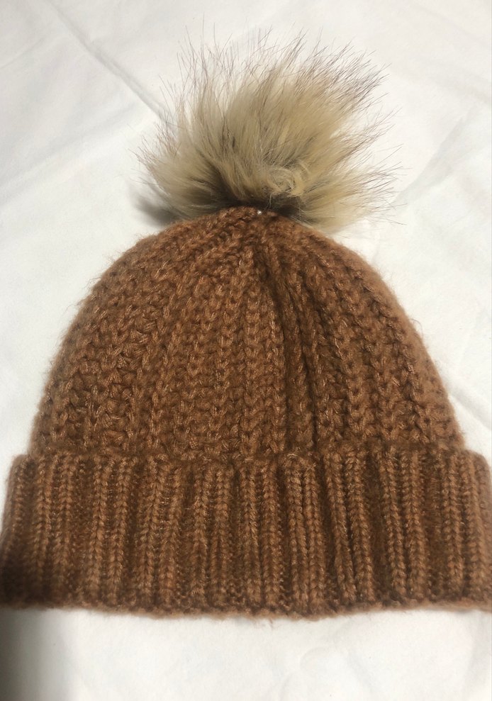 Parlak kürk ponpon detaylı, sütlü kahve renkli örgü kadın bere, sıcak ve bohem tarzda.
