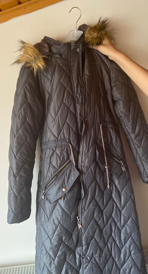 Kürk detaylı, kapüşonlu ve çıtçıtlı cep fermuarları bulunan, normal boyda gri kadın kış montu. Streetwear tarzına uygun, dikdörtgen desenli ve dar kesim.