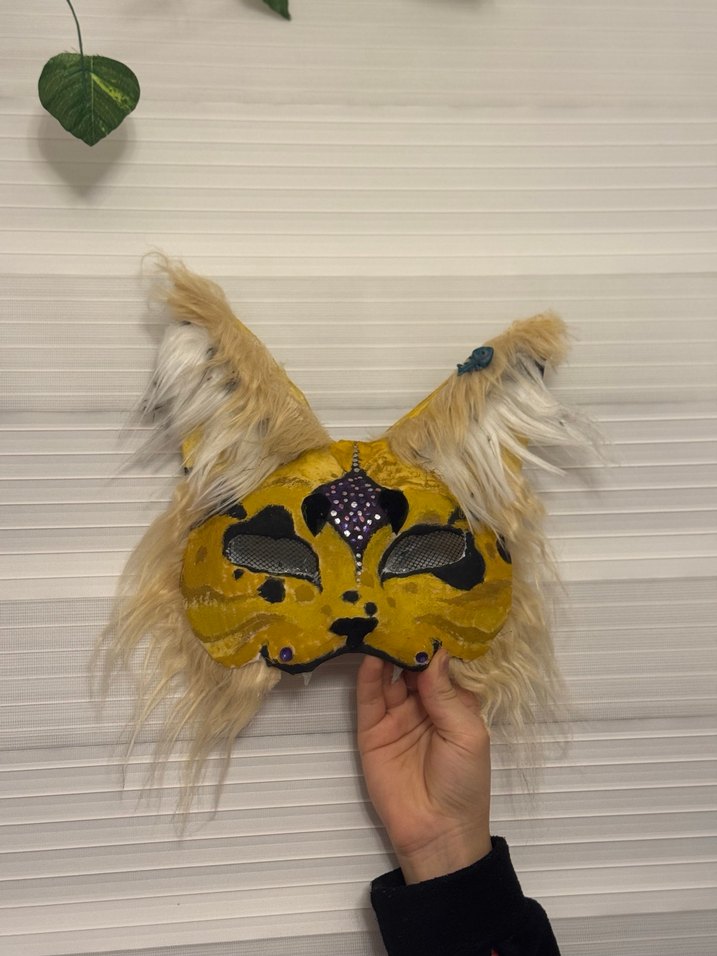 Uzun kürk kulaklı ve desenli sarı yüzeye sahip kadın hayvan maskesi, göz delikleri bulunur.