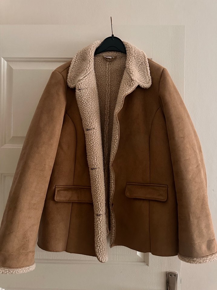 Kahverengi süet ceket, kürk detaylı, kesik yakalı ve uzun kolludur. Normal kesim ve midi boydadır, günlük kullanıma uygundur. Birkaç saatliğine giyildi. Sorunsuz. Yurtdışından alındı. M-L bedene uygun.