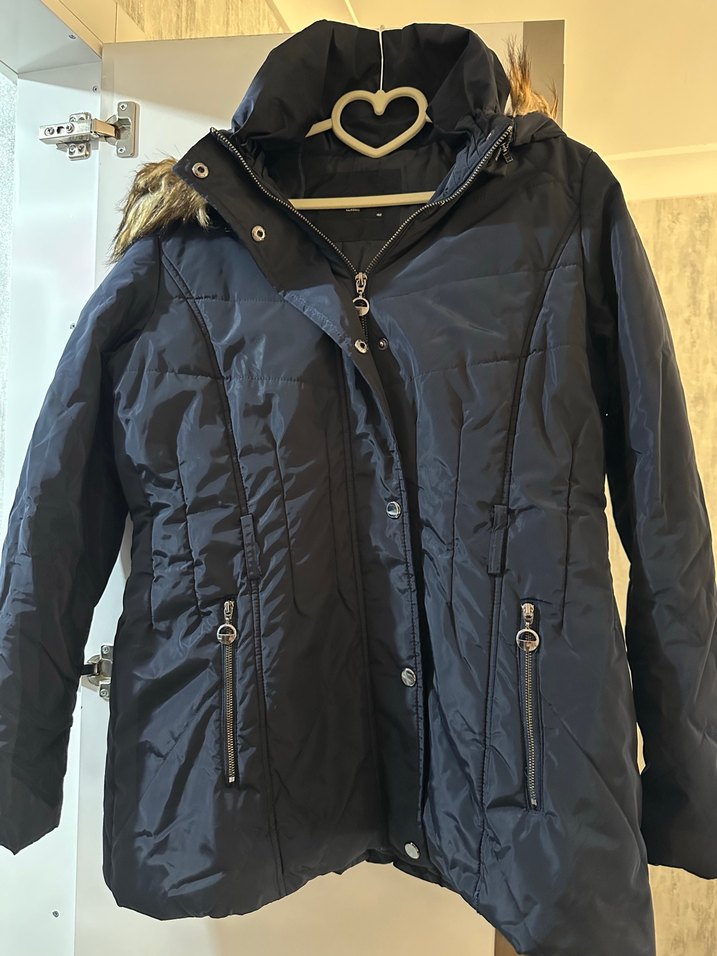 Kürk detaylı, dar kesim kışlık mont. Notched lapel yaka ve midi boy. Sentetik kumaştan, dış mekan için uygun.