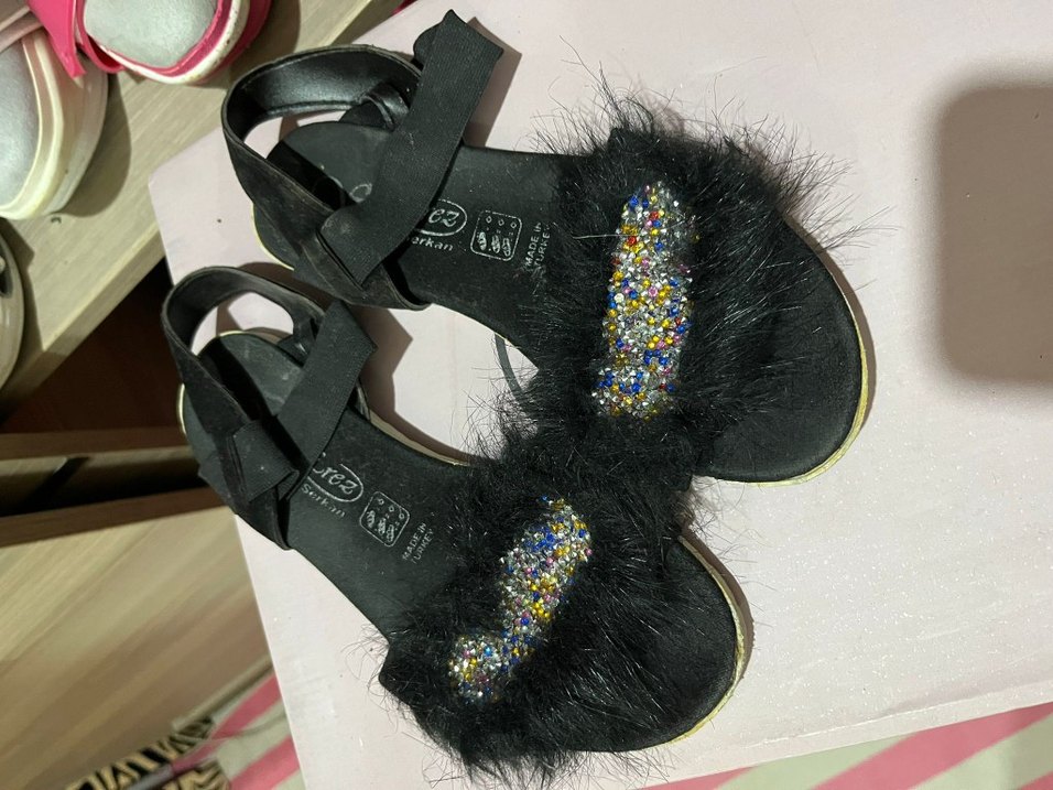 Kürk detaylı, çok renkli desenli süslemelere sahip dolgu topuklu sandalet, koyu renkli kauçuk tabanlı yürüyüş deniz kenarı vb için uygun casual ayakkabidır kullanilmadi beklemekten oyle görünüyor ama silince düzeliyor sorunsuzdur kullanmiyorum ben bu yüzden satışta marka temsilidir
