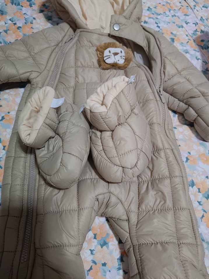 Kürk detaylı, kahverengi bebek montYaka tipi çentikli, desensiz ve içi dolgulu. Göğüs kısmında aslan figürü ve eldivenleri bulunur .