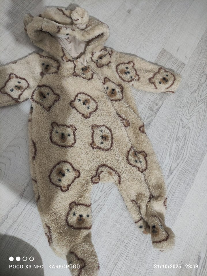 Kürk detaylı, kapüşonlu kahverengi bebek tulumu. Yumuşak ve sıcak kumaştan, ayaklı ve ayıcık desenlidir. Kısa süreli kullandım uyku tulumu veya dış giyim olarak kullanılabilir. lekesi defosu yoktur.