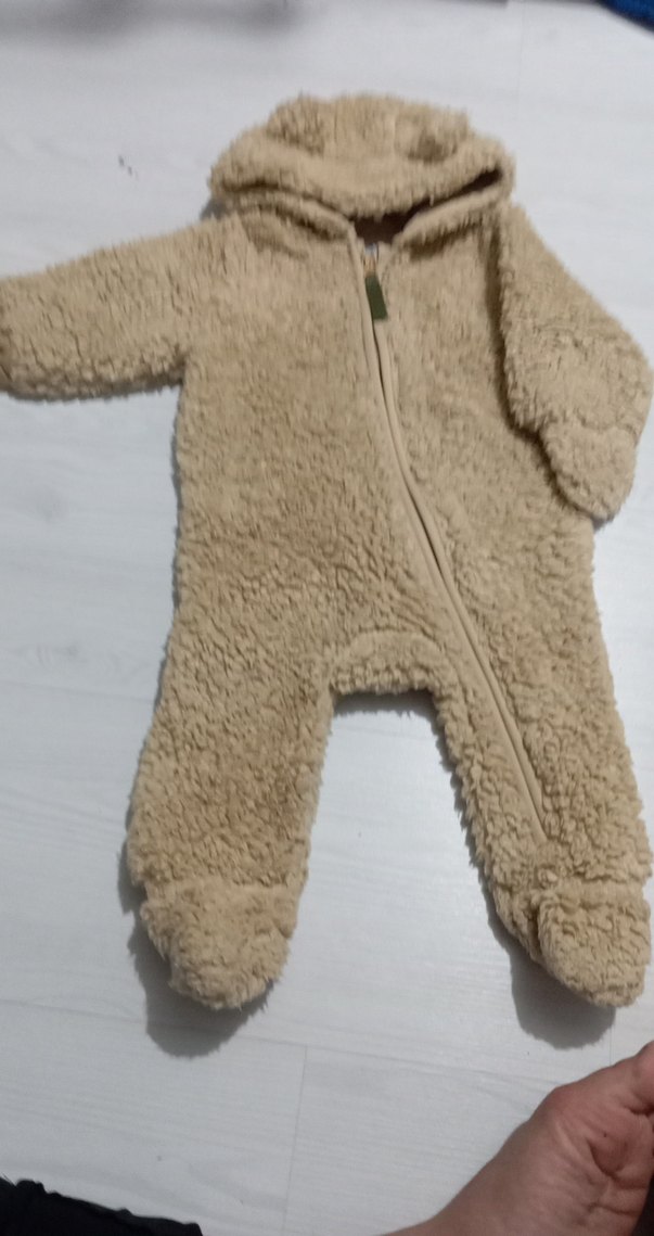 Kürk detaylı, kapüşonlu ve tam önden fermuarlı bu kahverengi bebek tulumu, elleri ve ayakları kapatarak sıcak tutar. ❄️