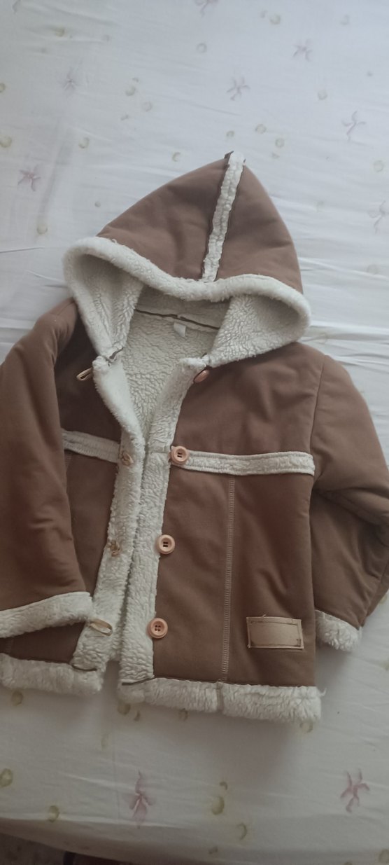 Kahverengi, fitted kesim çocuk kabanı, kürk detaylı ve kesik yaka. Sade, desen içermeyen sokak stili kıyafet.