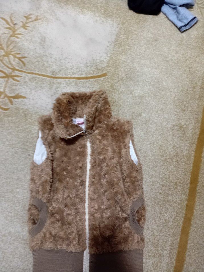 Kollarsız, kürk detaylı kahverengi yelek, yakalı ve vücuda oturan kesimiyle rahat ve şık bir sokak giyimi ürünü.