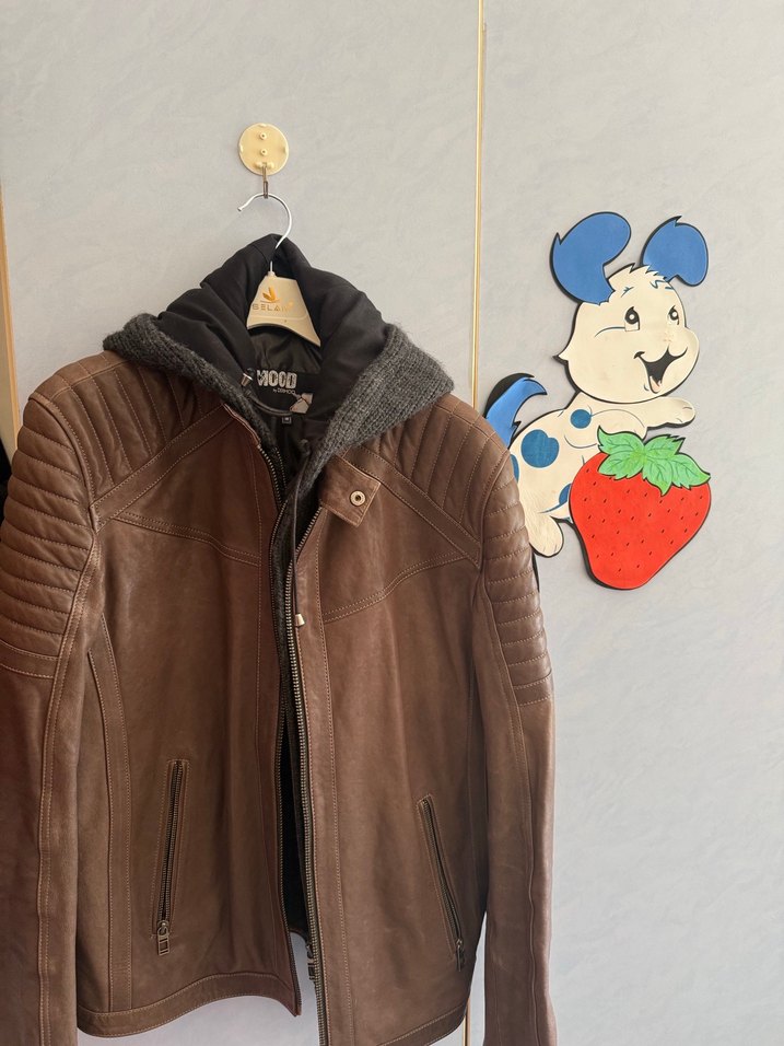 Kürk detaylı, kahverengi deri biker ceket. Geniş kesim, uzun kollu ve gri iç astarlı, gündelik sokak stili için uygundur.