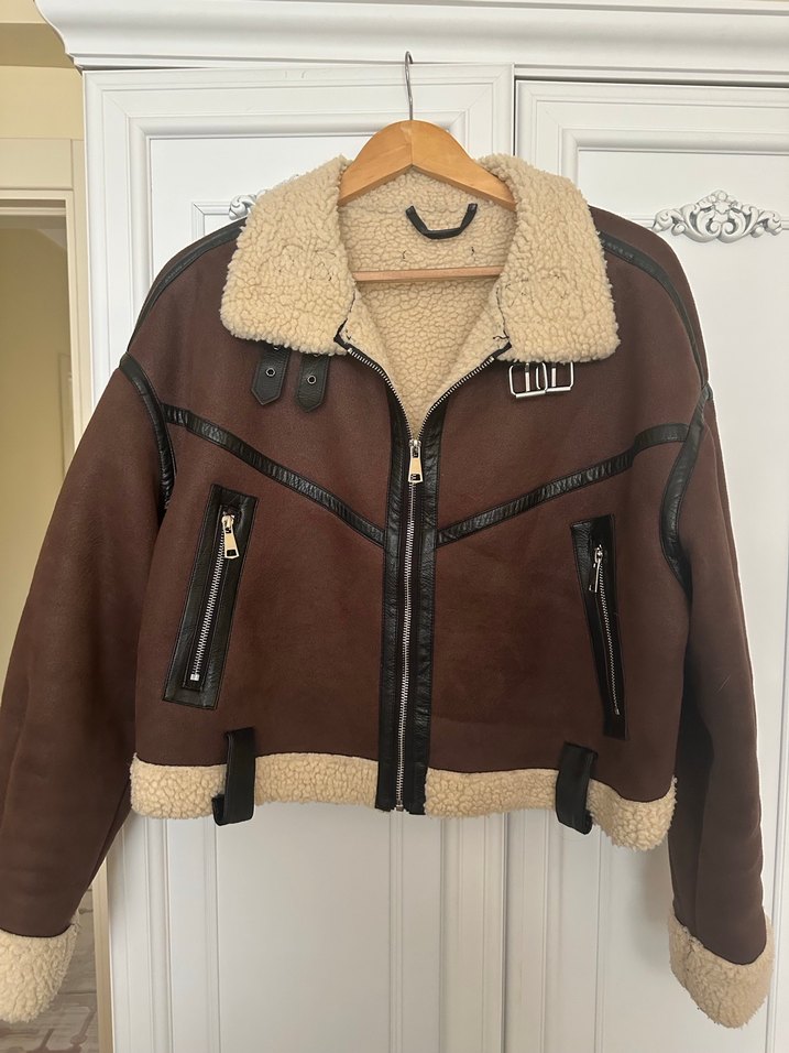 Kahverengi deri, kürk detaylı yakalı ve manşetli, normal boy midi kesim kadın ceket. İnce kesimli, desen içermeyen, günlük kullanım için uygun.storebyzr sayfasından almıştım . Kemeri de mevcut