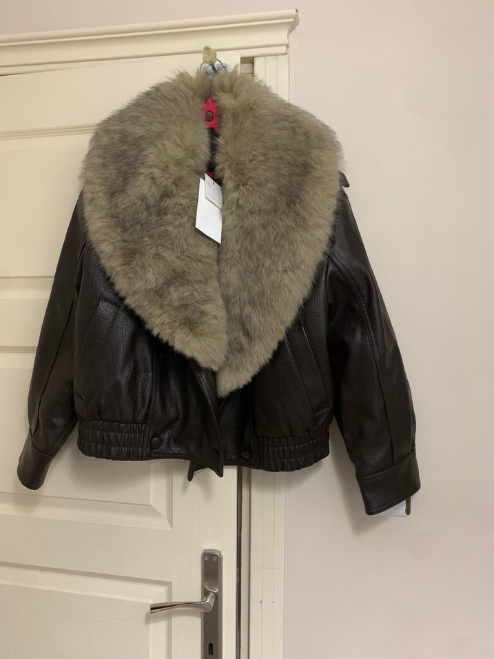 Kahverengi deri, kürk detaylı, uzun kollu, yakalı, normal midi boy kadın ceket. Sokak modasına uygun, şık ve fit kesim.