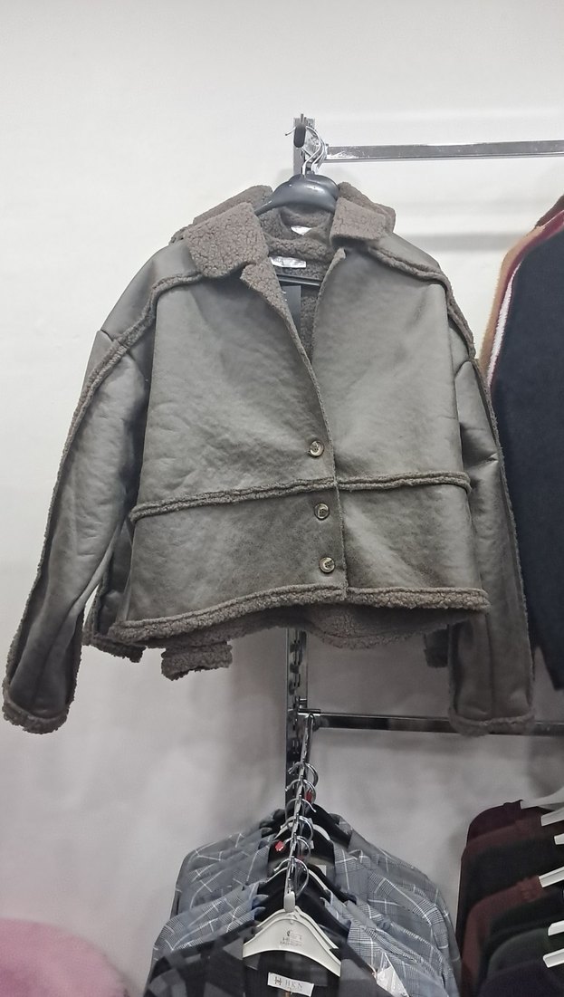 Kahverengi deri kadın ceket, kürk detaylı ve kesik yaka tasarıma sahiptir. Salaş kesim ve kısa boydadır, sokak stiline uygundur.