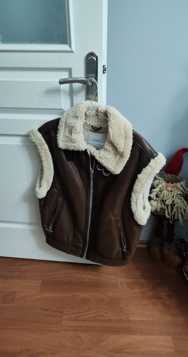 Koyu kahverengi deri kolsuz ceket, kürk detaylı yaka ve kol açıklıkları ile trend ve rahat bir görünüm sunar.